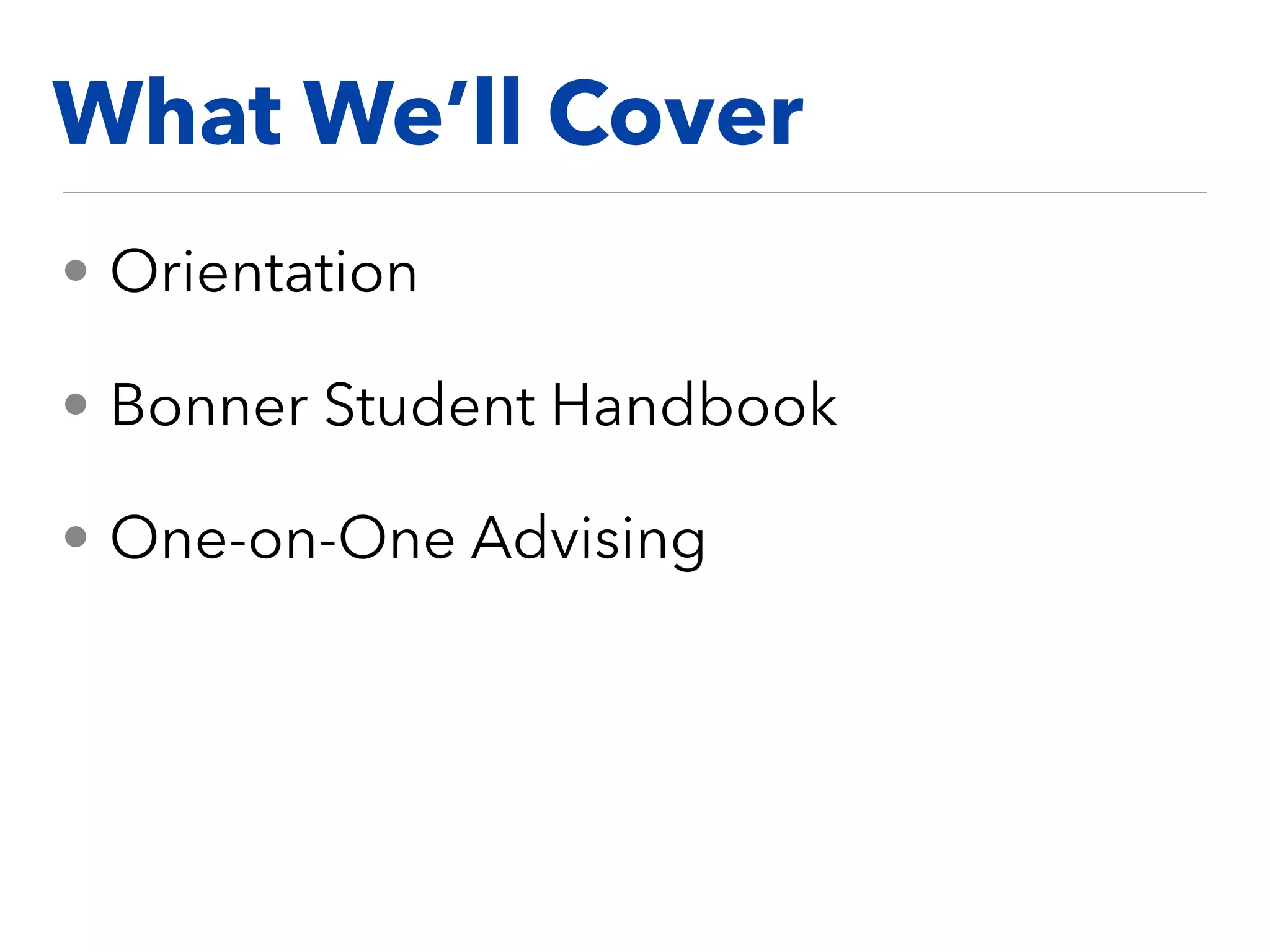 This document provides information about orientation, advising, and resources for Bonner students. It discusses holding orientation to build community among students and staff, establish expectations, and provide essential campus knowledge. Orientation activities include community building, learning about the Bonner program and its goals/expectations, and getting to know oneself, the community, and the college. It also outlines the Bonner student handbook which informs students of their roles and responsibilities. Finally, it discusses the importance of one-on-one advising meetings to support students' service and development.
