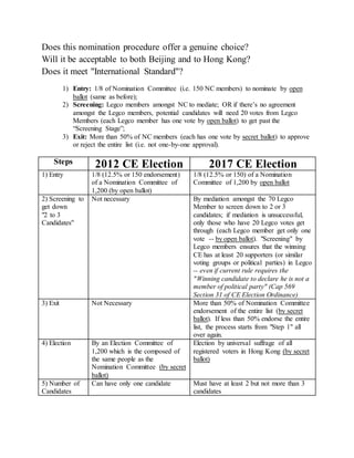This document compares the nomination process for the Chief Executive election in Hong Kong in 2012 and 2017. The 2012 process involved nomination by 1/8 of the Nomination Committee members, no screening stage, and election by the Election Committee. The 2017 process added a screening stage involving Legco members to narrow the candidates to 2-3, and requires over 50% Nomination Committee approval of the final list. It aims to find a process that offers choice, is acceptable to Beijing and Hong Kong, and meets international standards.