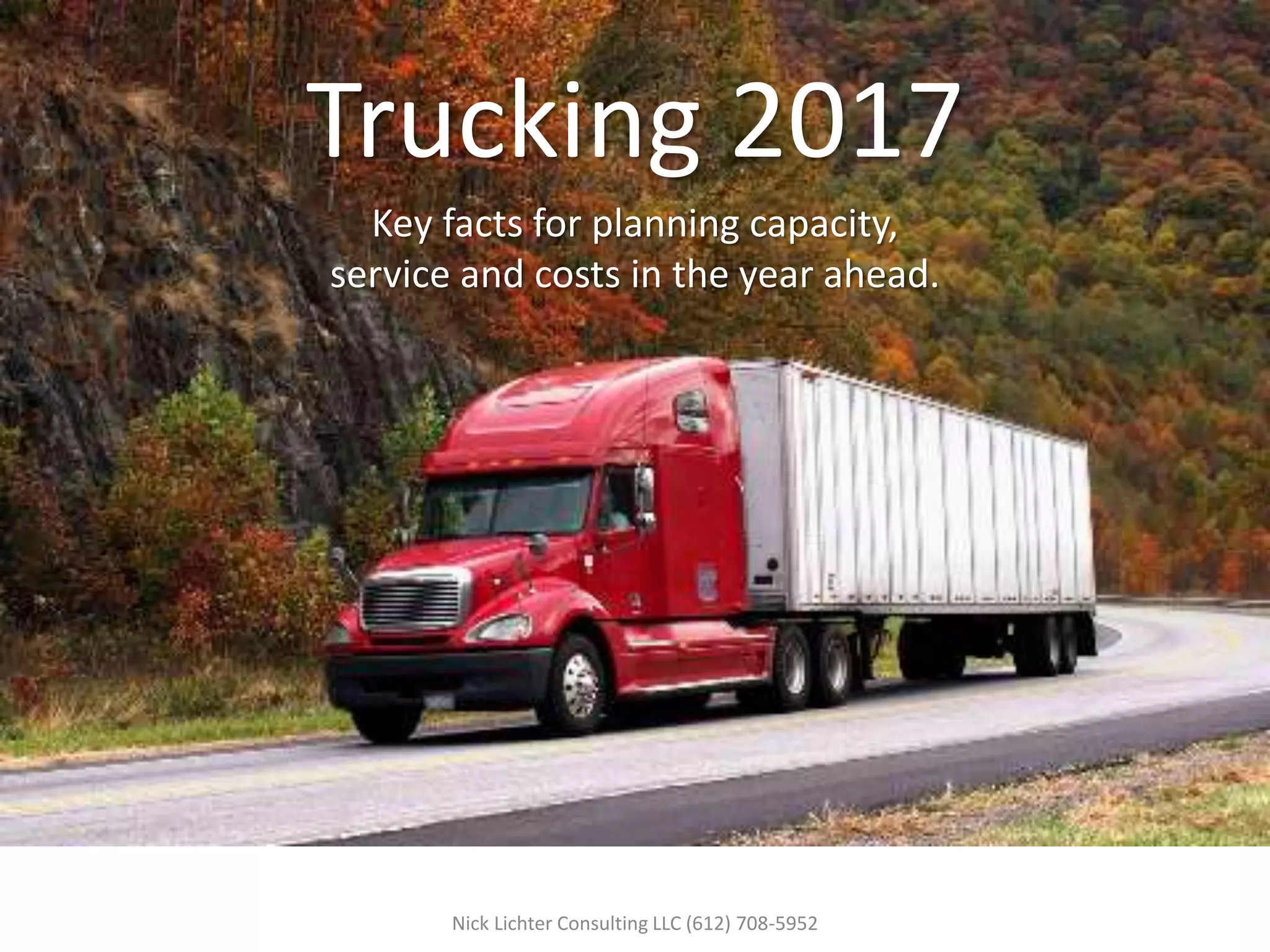 The document outlines the key challenges and opportunities in the 2017 trucking industry, highlighting issues like driver shortages, regulatory changes, and rising costs. It identifies a predicted growth of about 2.4% in the freight market, while noting the interrelationship between capacity, service, and costs. The text emphasizes the importance of building trust among shippers, carriers, and intermediaries to navigate this dynamic market.