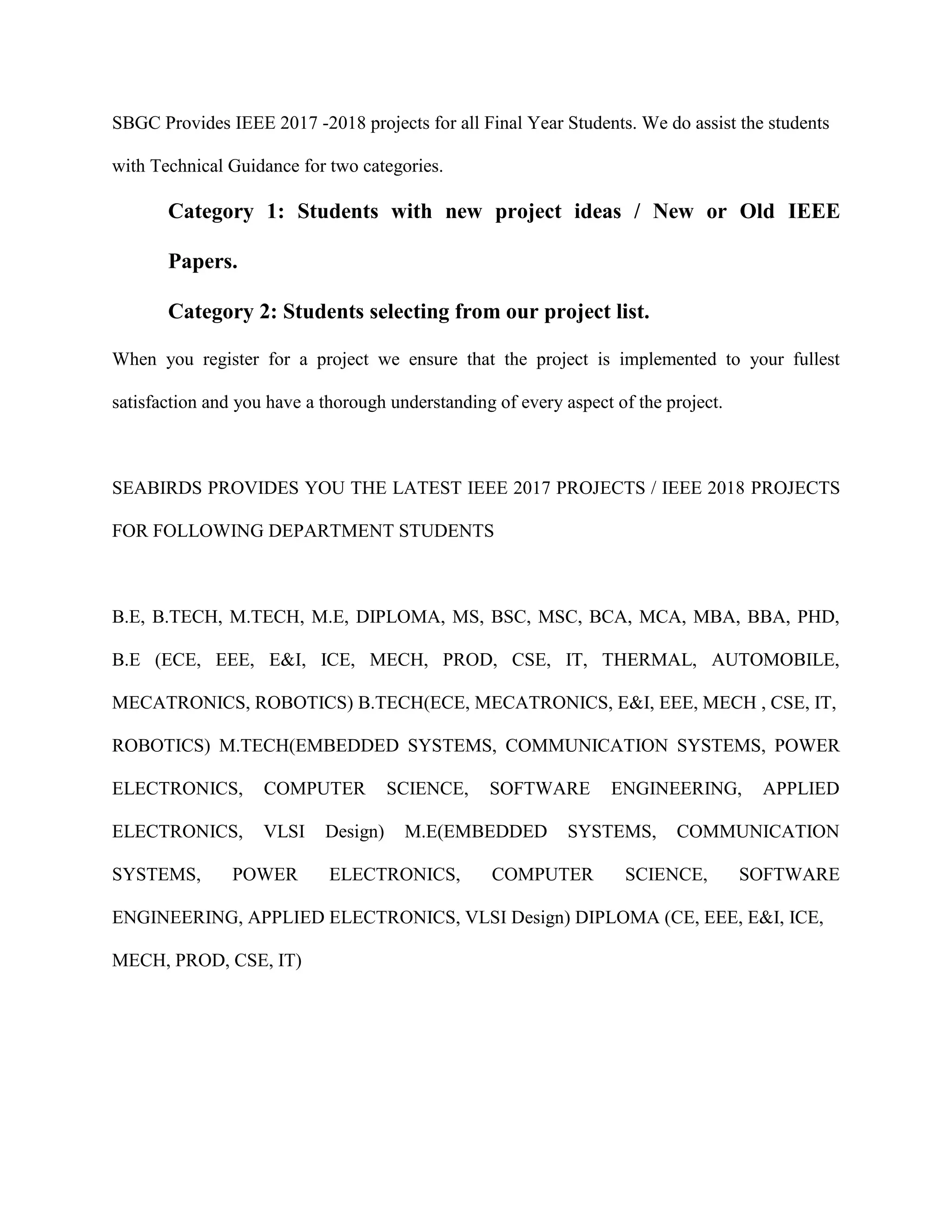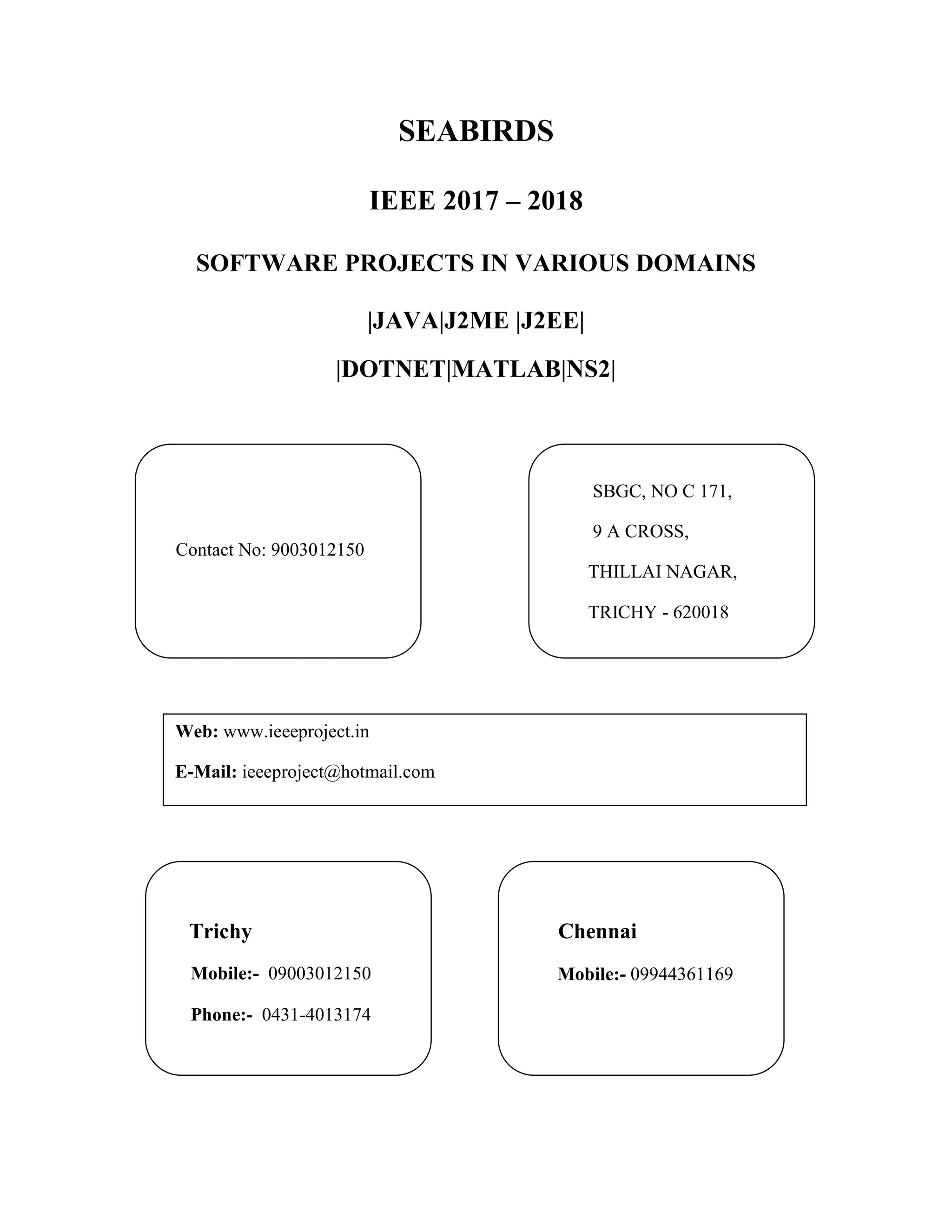 The document outlines various IEEE projects offered by Seabirds for students in multiple disciplines for the years 2017-2018, along with detailing available technical guidance and project support features. It includes summaries of several innovative research projects focused on topics like matrix factorization for recommender systems, personalized search, sentiment classification, energy-efficient web search processing, and more. Each project emphasizes a unique approach to solving contemporary computing challenges and improving efficiency across different domains.