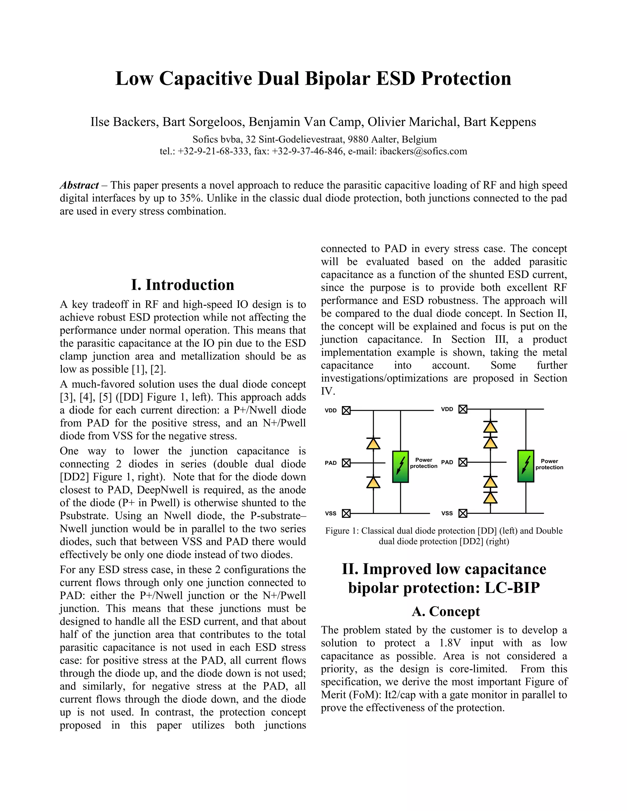 The document discusses a novel low capacitive dual bipolar ESD protection design aimed at enhancing RF and high-speed digital interface performance while minimizing parasitic capacitive loading. The proposed LC-BIP protection scheme utilizes both junctions in every ESD stress scenario, distinguishing itself from traditional dual diode methods and demonstrating improved capacitance performance with effective current distribution. Experimental results indicate the LC-BIP achieves significant capacitance reductions while maintaining robust ESD protection, making it suitable for 1.8V high-speed applications.