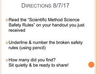 The document provides information about the scientific method, including the typical steps such as observing, questioning, forming a hypothesis, experimentation, and analyzing results. It discusses the key components of experiments, including variables and controlling experiments. Various examples are used to illustrate the different steps of the scientific method.