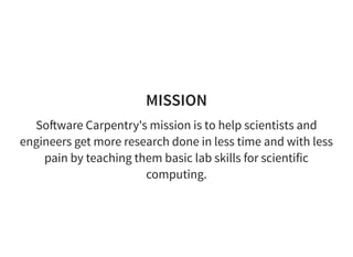 1. Software Carpentry's mission is to teach scientists basic coding skills like shell, Git, and Python to help them do research more efficiently.