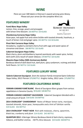 Peterson's restaurant offers an extensive wine selection with over 500 labels, including high-end options like the 2012 Galerie Cabernet Sauvignon at $75 per bottle, and a variety of featured California wines. The menu features a range of charcuterie boards, prime rib egg rolls, and various sliders, alongside weekly promotions for craft cocktails and beer nights. Additionally, guests can enjoy dessert wines and promotional dining rewards, with events available for hosting parties.