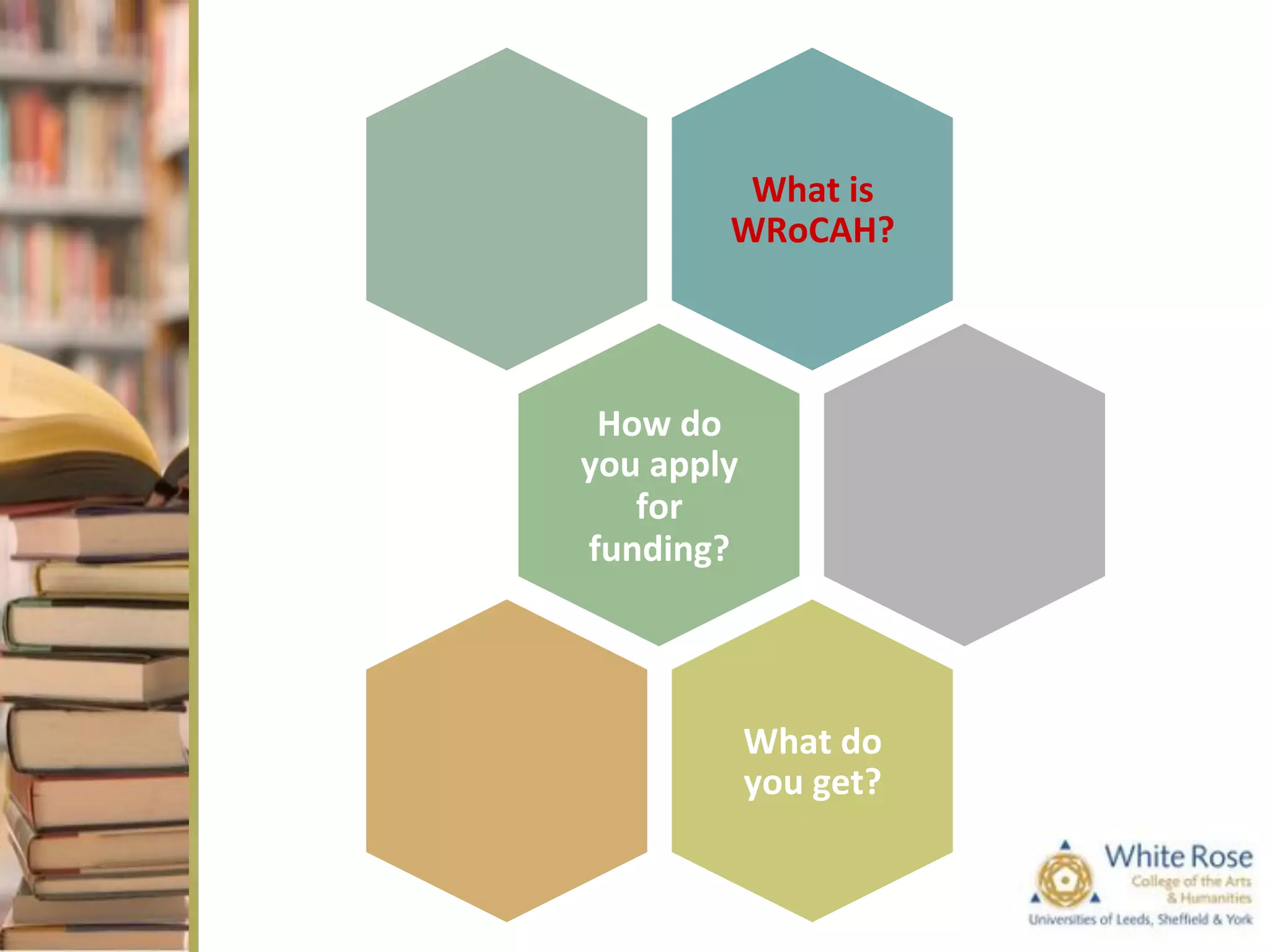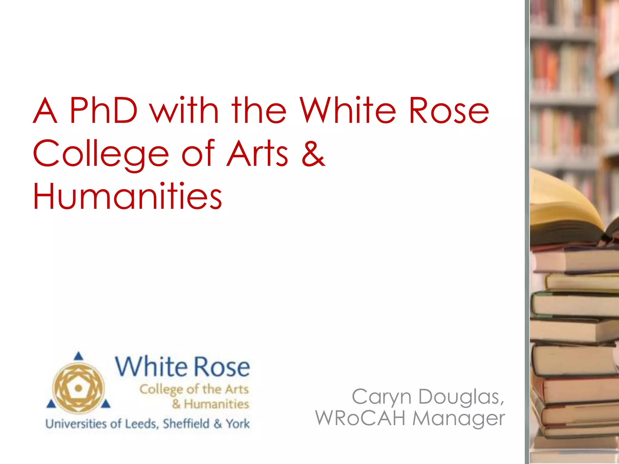 The document provides information about the White Rose College of Arts and Humanities (WRoCAH), a collaborative doctoral training partnership between the Universities of Leeds, Sheffield, and York. It details the funding opportunities for PhD students through WRoCAH, including fees and stipend awards from the Arts and Humanities Research Council (AHRC) worth over £19 million. Students accepted into WRoCAH receive membership in a cohort, access to training programs, and additional funding for research support and mobility. The training involves events and colloquiums over the three years to facilitate learning and skills development.