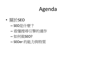 本文件介绍了搜索引擎优化(SEO)的基本概念、运作机制以及执行方法,旨在帮助客户和潜在客户提升搜索结果可见性。SEO的目标是让搜索引擎理解网站内容并解决用户问题,同时强调内容丰富性和用户体验的重要性。文档还探讨了SEO从业者应具备的技能与特质,区分了白帽和黑帽SEO的不同策略。