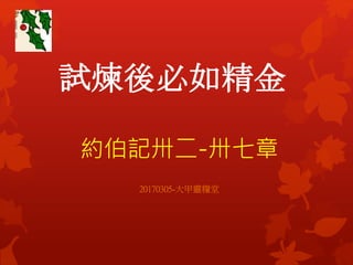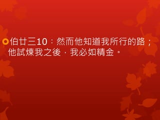 文档讨论了《约伯记》中对苦难、信仰与神公义的探讨,强调即使在逆境中也要信任神的计划。通过约伯及其朋友的对话,揭示了对神的理解与失落感的矛盾,以及人应当如何在苦难中持守信仰。最终,强调顺服神的主权和对神的敬畏,是克服困境的重要态度。