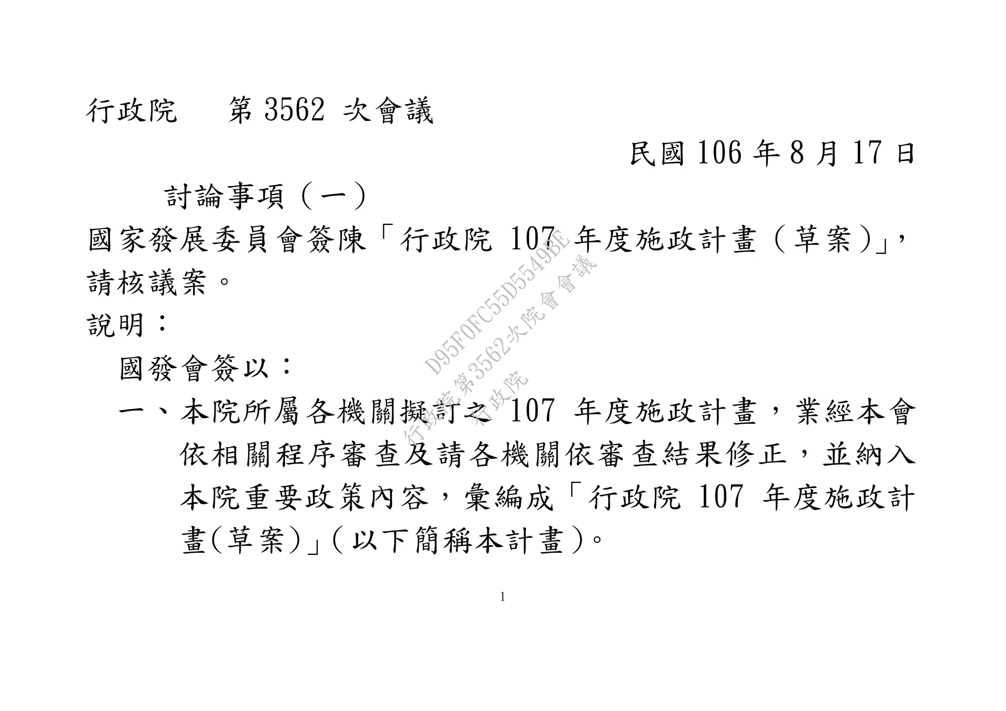 行政院107年度施政計畫草案包括250項施政目標及471項關鍵績效指標,重點在於產業轉型、公共建設、社會安全、政府治理、教育文化、及國家安全等六大領域。各機關需根據總統治國理念及核心價值,推動具體政策與措施。計畫通過後,將與中央政府總預算案一併送立法院審議。