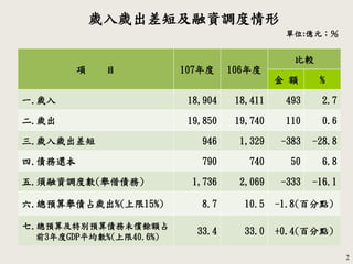 107年度中央政府總預算案歲入為1.89兆億元,較106年度增長2.7%,而歲出為1.985兆億元,僅增長0.6%。此年度歲入歲出差短946億元,相較於106年度減少383億元,顯示財政狀況有所改善。債務舉借和未償餘額均有所減少,反映出政府在財政健全方面的努力。