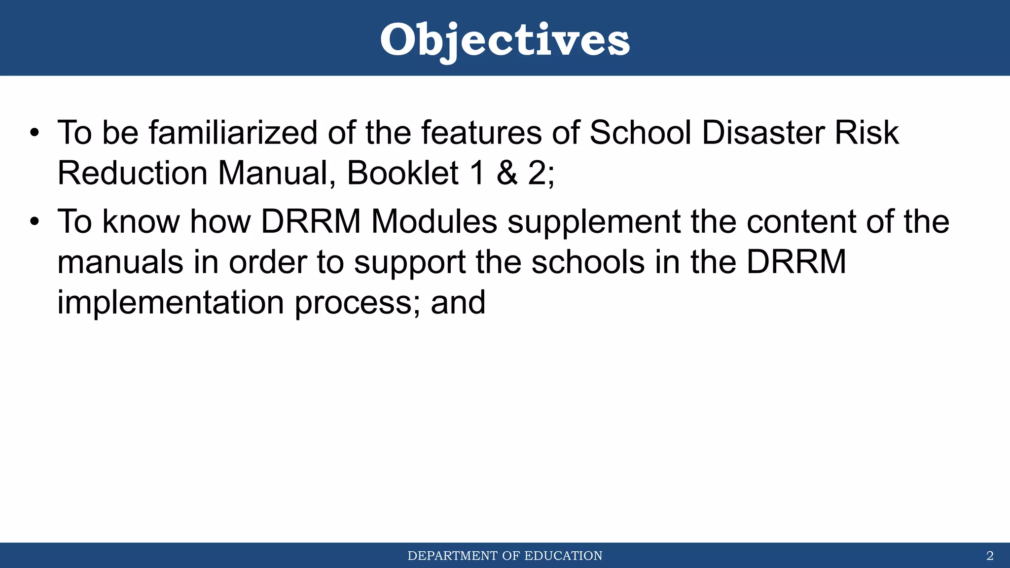 The document discusses how the DRRM Modules supplement the School Disaster Risk Reduction Management (SDRRM) Manual. The modules provide competencies to support schools in implementing the 4 steps of DRRM: 1) Assess, 2) Plan, 3) Implement Plan, and 4) Monitor, Evaluate, and Report. Some competencies include understanding hazards, mainstreaming DRRM into planning, and using alternative delivery modes. The overall goal is to build capacity of DRRM Coordinators to help schools accomplish international, national, and local DRRM frameworks and standards.