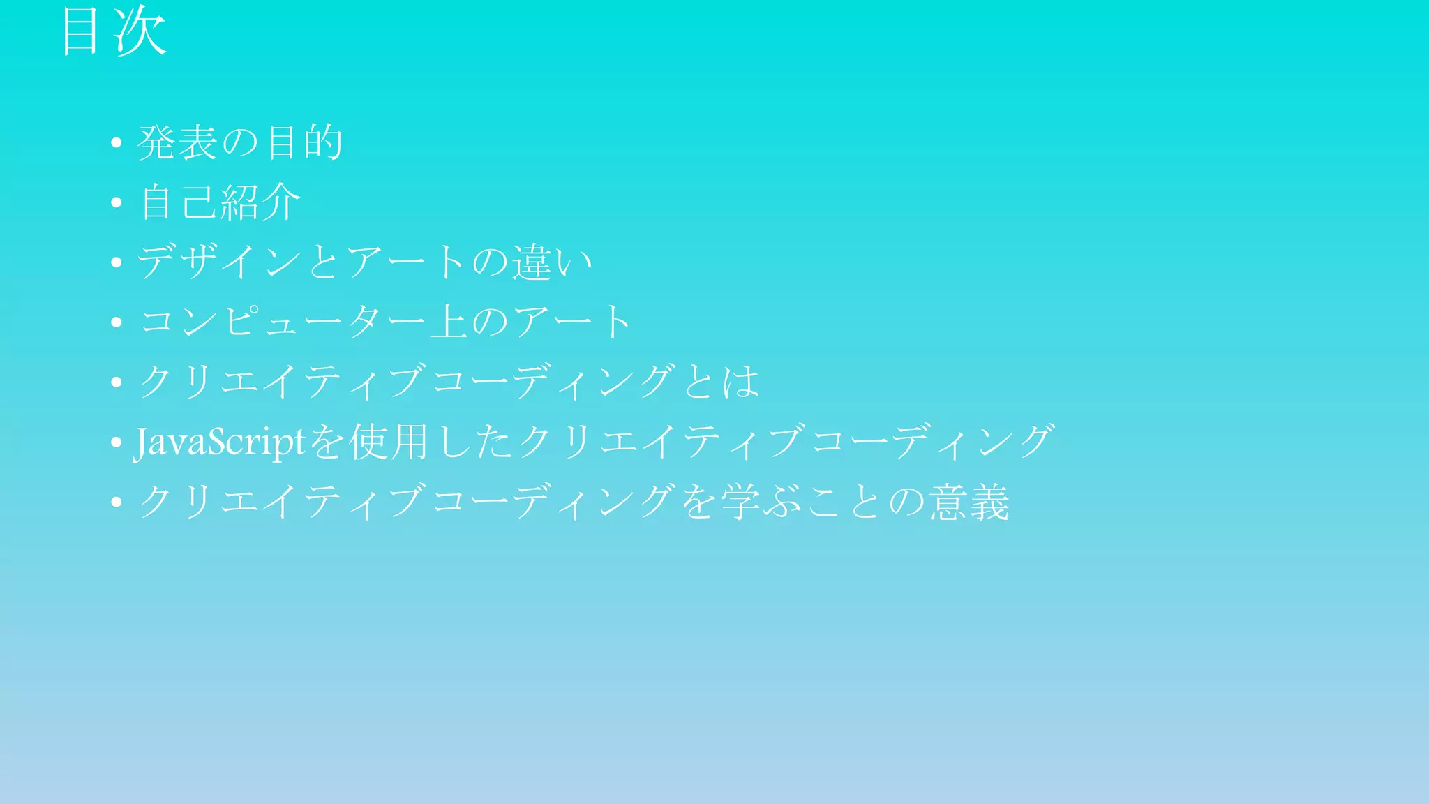 デザインとアートの違い • コンピューター上のアート • クリエイティブコーディングとは • JavaScriptを使用したクリエイティブコーディング • クリエイティブコーディングを学ぶことの意義