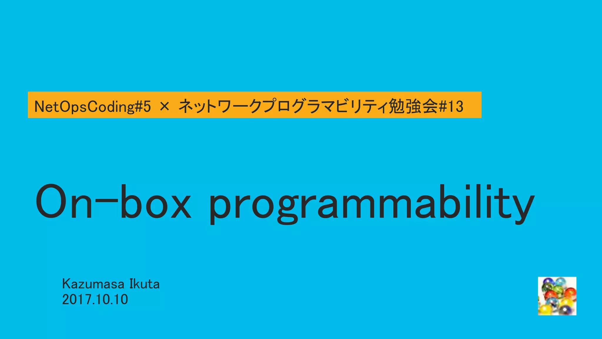 On-box programmability allows networking devices to run scripts and programs directly on the device to enable event-driven automation and monitoring. The document discusses how Cisco, Juniper, Arista, and now Catalyst devices support various scripting languages like Python, Tcl, and Lua through mechanisms like Cisco's Embedded Event Manager (EEM). It provides an example of using EEM and a Python script on a Catalyst 3850 to detect routing table changes and post a message to Cisco Spark, demonstrating how on-box programmability can integrate with external systems.