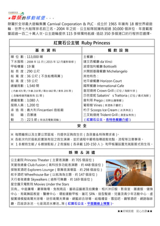 本文件介绍了为期10天的"墨西哥.洛杉矶"红宝石公主号邮轮之旅,强调无自费行程、各类设施和丰富的娱乐活动。豪华邮轮具备先进的设施与顶级餐饮选择,适合不同旅客的需求,提供独特的海陆旅行体验。行程包括洛杉矶等多个热门旅游地点,让游客尽享美丽风景和愉快活动。