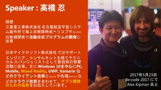 Speaker : 高橋忍 経歴 三菱重工業株式会社 名古屋航空宇宙システ ム製作所で海上自衛隊哨戒ヘリコプタSH-60K の新規開発で自動操縦プログラムの開発に 従事 日本マイクロソフト株式会社 ではサポート エンジニア、コンサルタントを経てテクニ カル エバンジェリストとして新技術の啓蒙 活動に従事。主に Windows 10を中心にPC, Mobile, Mixed Reality, UWP, Xamarin な どのクライアント技術とAzure や各種Service な どのクラウド技術を合わせて、アプリ開発 のための技術をお伝えしています。