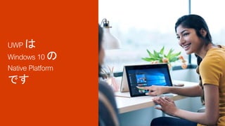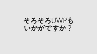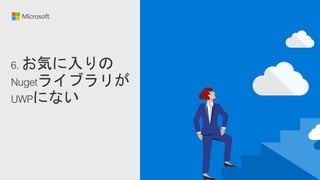 1. そもそも UWPをMicrosoftが使ってないんじゃない? 2. UWPはSQL Server に接続ができない 3. UPWは既存システムと連携できない 4. UWPは重要なデスクトップの機能がない 5. UWPは始めるのが難しすぎる 6. お気に入りのNugetライブラリがUWPにない 7. UWP は iOS や Android などクロスプラットフォームに 非対応