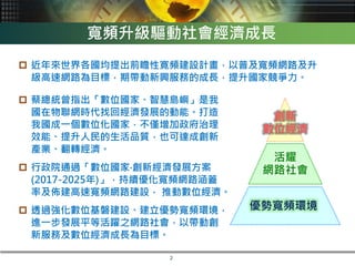 该文档讨论了数字通信传播法律和电信管理法草案的改革,旨在通过提升宽带网络建设和推动数字经济,实现国家的经济转型与发展。强调数字国家与创新经济的目标,呼吁政府强化数字基础设施,促进市场竞争并建立公平的网络环境。通过立法调整以适应科技创新,确保数字服务的普及与安全。