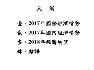 2017年全球經濟持續復甦,成長率提升至3.6%,受益於主要經濟體進口需求增加。國內經濟也顯示增長潛力,經濟成長率預測上調至2.58%,主要受到民間消費和出口的強勁表現推動。失業率保持穩定,物價漲幅相對平穩,顯示出經濟逐步回暖的跡象。