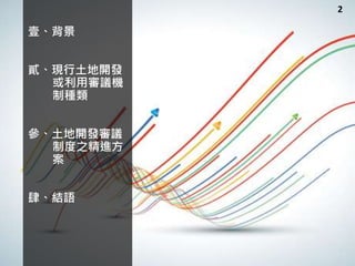 本报告探讨了台湾土地开发审议制度的现状与改进方案,旨在加快土地开发利用的审议速度。当前审议机制虽为专业性、多元价值,但在复杂案件处理上存在时效问题。为提高效率,建议实施初步预审及自评机制,并加强与相关部门的沟通协作,以优化审议流程。