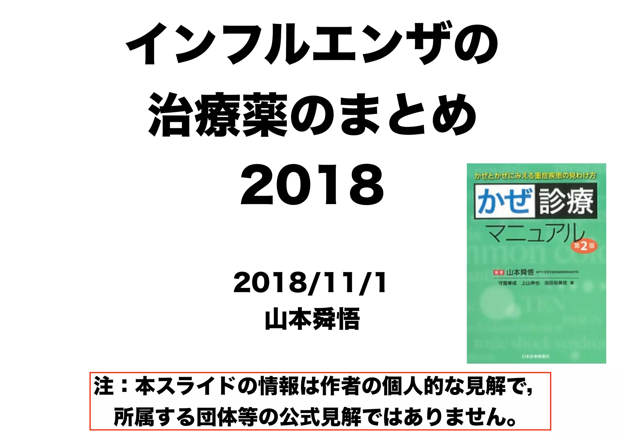 インフルエンザの 治療薬のまとめ 2018 注:本スライドの情報は作者の個人的な見解で, 所属する団体等の公式見解ではありません。 2018/11/1 山本舜悟