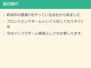 自己紹介 • 新潟市の農業ITをやっている会社から来ました • フロントエンドチームとして入社してもうすぐ2 年 •