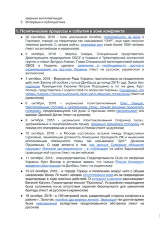 Документ представляет собой мониторинг событий, связанных с гибридной войной на востоке Украины, и описывает усилия международной платформы civilm+ по восстановлению мира и верховенства права. В нем содержатся данные о политических процессах, законодательных инициативах и гуманитарной помощи, направленной на преодоление последствий конфликта. Также обсуждаются события и инициативы, касающиеся защиты прав человека и поддержки пострадавших от войны.
