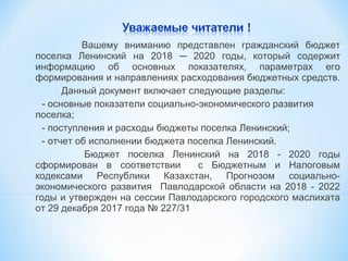 Документ представляет гражданский бюджет поселка Ленинский на 2018-2020 годы, включающий основные показатели социально-экономического развития, поступления и расходы бюджета. Бюджет сформирован согласно законодательству Республики Казахстан и охватывает значимые направления финансирования, такие как образование, социальная защита, культура и ЖКХ. Основные расходы на 2018 год составляют 240 906 тыс. тенге, при этом предусмотрены мероприятия для улучшения жизни в поселке, включая поддержку образования и благоустройство.