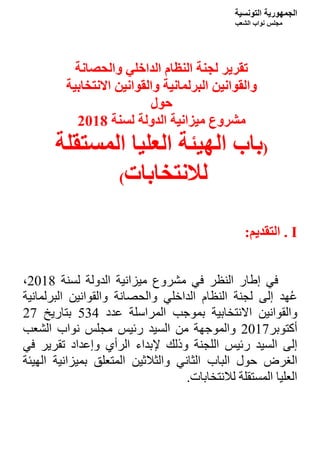 يتعلق التقرير بمشروع ميزانية الهيئة العليا المستقلة للانتخابات لسنة 2028، حيث تم تقديم تخفيض في النفقات مقارنة بسنة 2022 بنسبة 3%. ويناقش التقرير تفاصيل النفقات المتعلقة بتسيير الانتخابات الجهوية والبلدية، مع التركيز على أهمية توفير الاعتمادات اللازمة لضمان إجراء الانتخابات في مواعيدها المحددة.