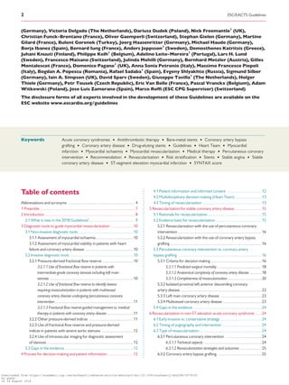 This document provides guidelines on myocardial revascularization from the European Society of Cardiology (ESC) and European Association for Cardio-Thoracic Surgery (EACTS). It was developed with contributions from other cardiovascular organizations. The guidelines cover diagnostic tools for guiding revascularization, the decision-making process including use of a multidisciplinary heart team, and recommendations for revascularization in stable coronary artery disease and acute coronary syndrome patients. The guidelines represent the current expert consensus on best practices for revascularization procedures.