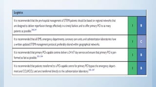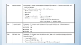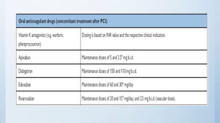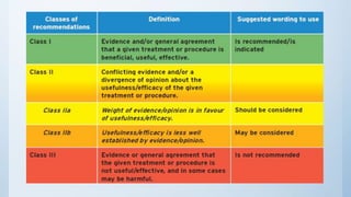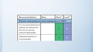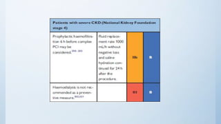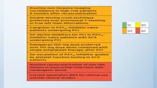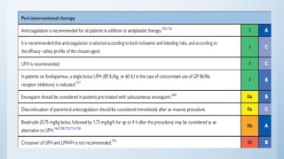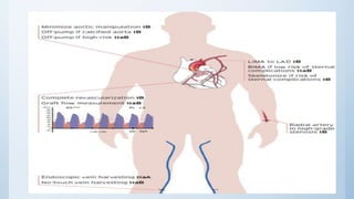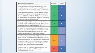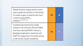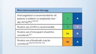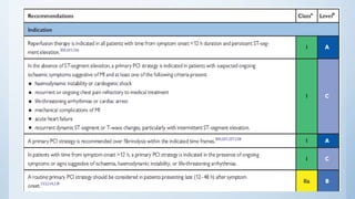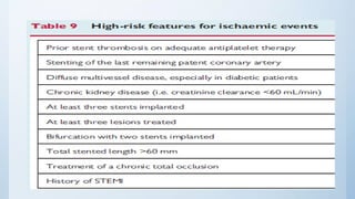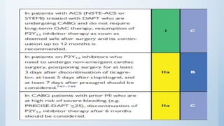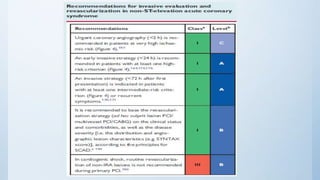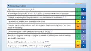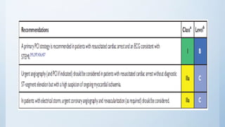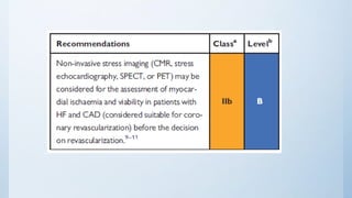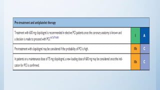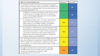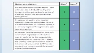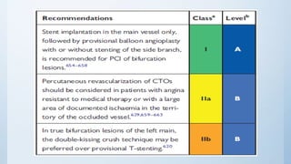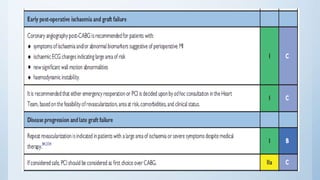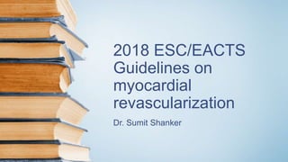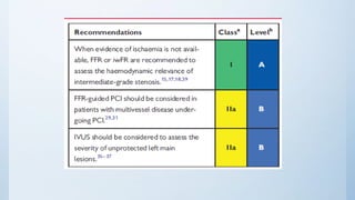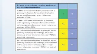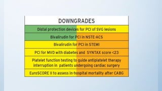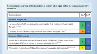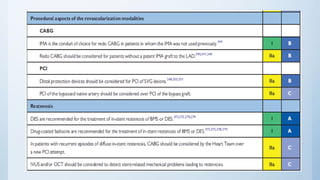 This document summarizes the 2018 ESC/EACTS Guidelines on myocardial revascularization. It discusses diagnostic tools to guide revascularization such as non-invasive imaging and invasive tools like fractional flow reserve. It also covers revascularization approaches for stable coronary artery disease, NSTEMI, STEMI, heart failure, diabetes, kidney disease and more. Procedural aspects of CABG and PCI are also summarized.