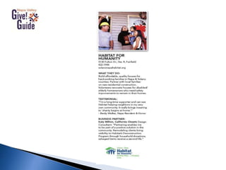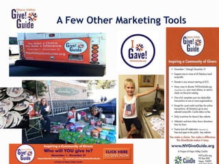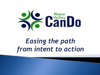 CanDo is a 501(c)3 nonprofit founded in 2009 that seeks to expand community volunteers and originate projects to benefit Napa County. The Napa Valley Give!Guide is an annual giving campaign coordinated by CanDo that raises funds for local nonprofits. It began in 2013 with 40 organizations raising $106,000, and by its 5th year included 46 nonprofits that collectively raised $466,000. The Give!Guide utilizes an annual catalog and website to promote eligible nonprofits and allow donors to easily contribute to causes of their choice.