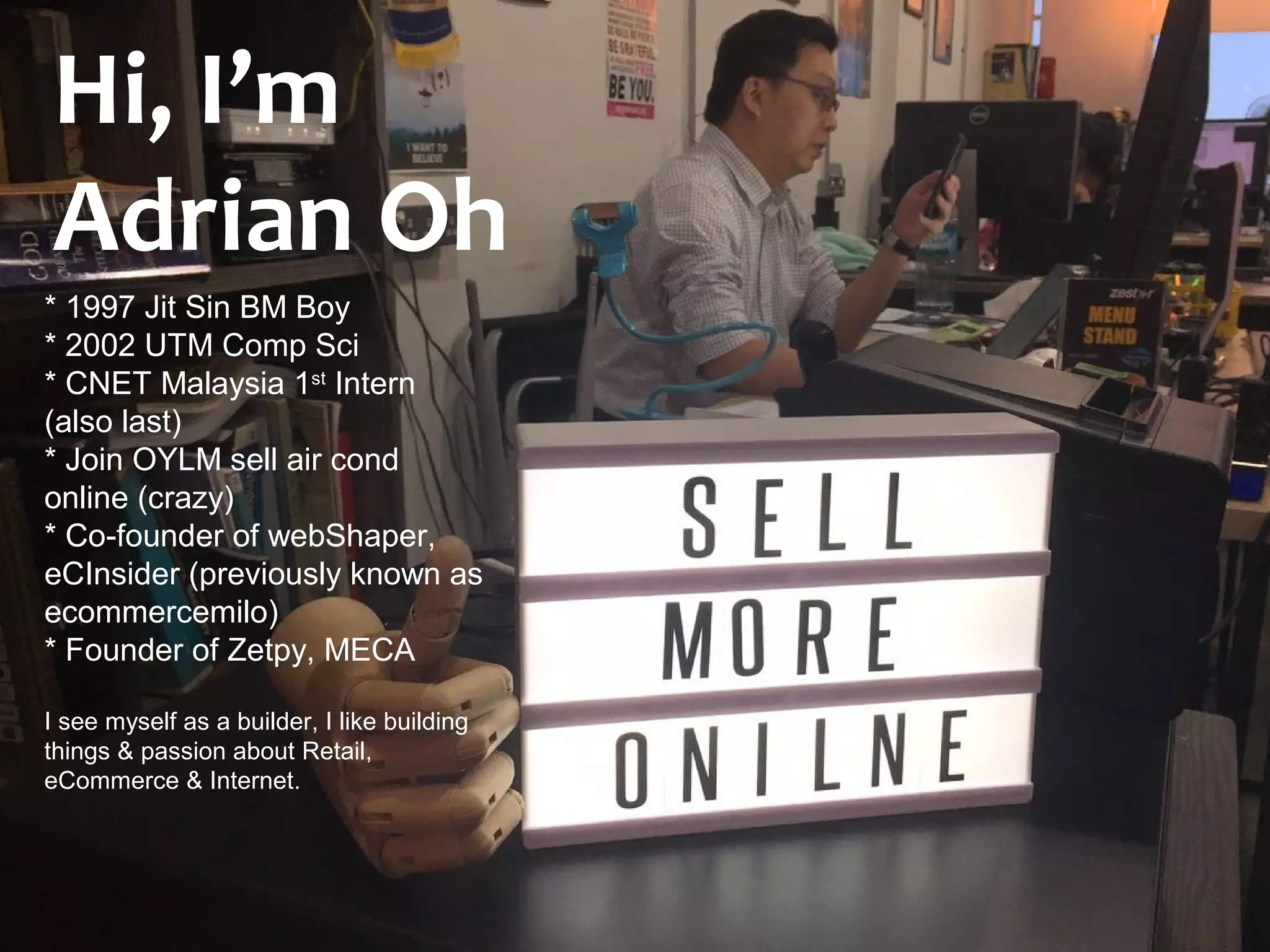 The document introduces Adrian Oh's journey as an entrepreneur in the ecommerce space, detailing his ventures like Webshaper and Zetpy. It explains various types of ecommerce, emphasizing the online-to-offline (o2o) model and its significance for both brick-and-mortar and online retailers. Additionally, it discusses the future of retail as omnichannel, where the lines between online and offline shopping are increasingly blurred.