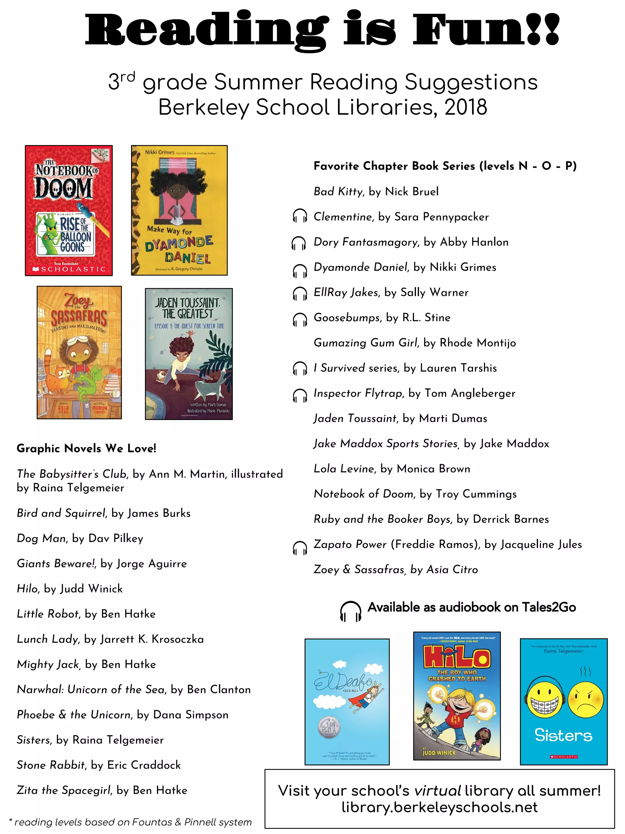 This document provides summer reading suggestions for 3rd grade students from the Berkeley School Libraries. It recommends several graphic novels, chapter book series, and genres of fiction and nonfiction books. Some of the highlighted graphic novels include The Babysitter's Club and Dog Man. Recommended chapter book series span reading levels N through S and include Clementine, Bad Kitty, and Warriors. The fiction genres highlighted are exciting adventure & fantasy books, funny stories, and stories that touch your heart. The nonfiction section recommends books about animals, history, sports, and biographies. It encourages students to visit their school's virtual library over the summer.