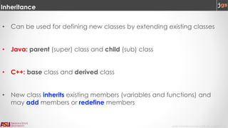 The document discusses inheritance and polymorphism in C++ programming. It explains that inheritance allows new classes to extend existing classes, inheriting their members. Polymorphism allows pointers to a base class to refer to derived class objects, with dynamic dispatch determining which implementation of a virtual member function to call based on the actual object type. Examples are provided of defining base and derived classes that demonstrate inheritance of members and polymorphic calls through base class pointers.