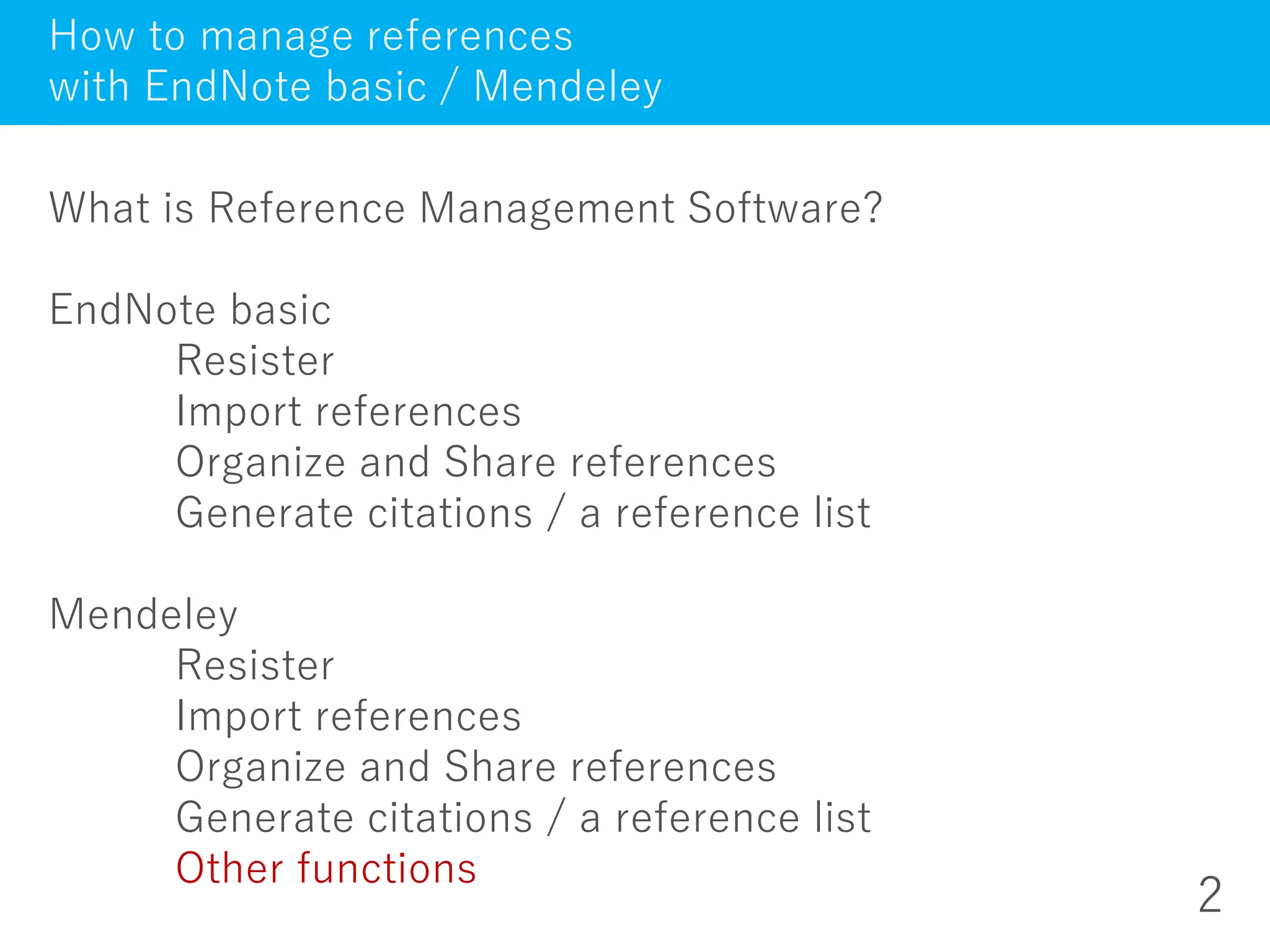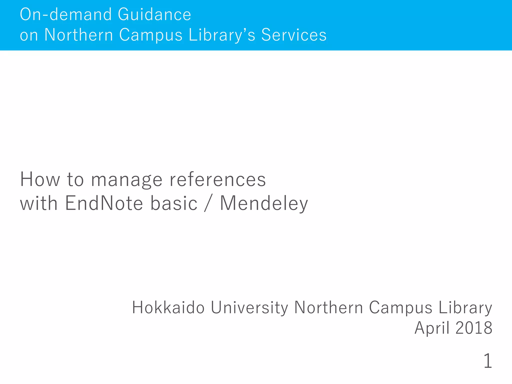This document provides an overview and instructions for using reference management software EndNote Basic and Mendeley. It summarizes their key functions, including importing references from databases and web pages, organizing references into folders, generating citations and bibliographies in papers, and additional features available through Hokkaido University subscriptions. The document recommends which software to use based on research needs and provides contact information for library support.