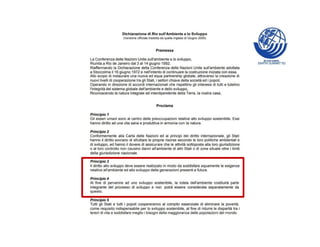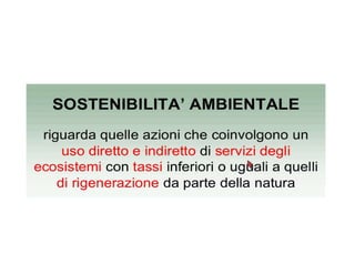 Il documento discute il concetto di sostenibilità, evidenziando l'importanza di uno sviluppo sostenibile che soddisfi i bisogni attuali senza compromettere le generazioni future. Si fa riferimento a convenzioni internazionali, come la dichiarazione di Rio e l'agenda 2030, sottolineando la necessità di una gestione sostenibile delle risorse, della biodiversità e dei servizi ecosistemici. Inoltre, si esplorano nuovi approcci economici, come l'economia circolare e la green economy, per ridurre l'impatto ambientale e promuovere l'equità sociale.