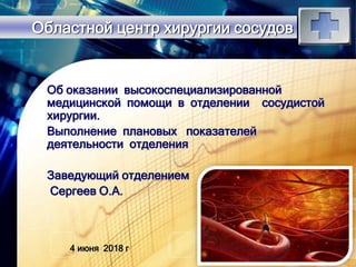 Документ содержит отчет о деятельности отделения сосудистой хирургии, включая выполнение плановых показателей и использование международных стандартов. В нем представлена статистика по количеству операций, показателям послеоперационной летальности и хирургической активности, а также инновационные методы и проблемы отделения. Также обсуждаются пути решения выявленных проблем и перспективы дальнейшего развития службы.