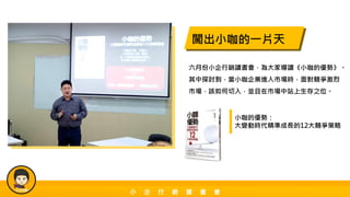 小企行銷讀書會導讀《小咖的優勢》,探討小型企業如何在競爭激烈的市場中找到生存之道,並提供12大競爭策略。參與者通過個案分析和互動討論,學習如何運用選擇與集中策略來建立優勢,並強調顧客忠誠度的重要性。會議旨在幫助中小企業經營者建立適應性策略,提升自身在市場中的競爭力。