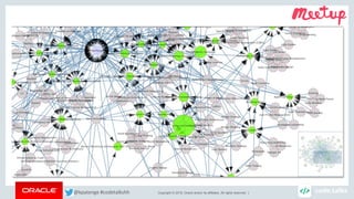 This document discusses analyzing social media data from Meetup.com using graph technologies. It describes retrieving data via the Meetup API, modeling the data as a graph, analyzing the graph using algorithms and tools like PGX and PGQL, and visualizing results in Cytoscape. Potential questions that could be answered include identifying influential people and groups, relationships between groups, and hot topics. The demo environment uses Oracle Big Data Lite with Oracle NoSQL Database to store the graph and analyze it.
