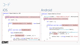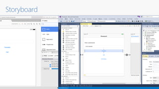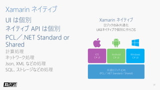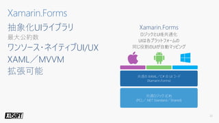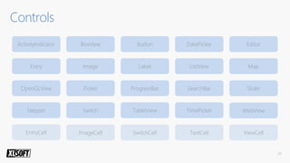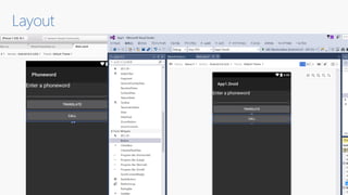 - A Xamarin.Forms code snippet defines a login page with an image, label, entry and button laid out in a stack layout