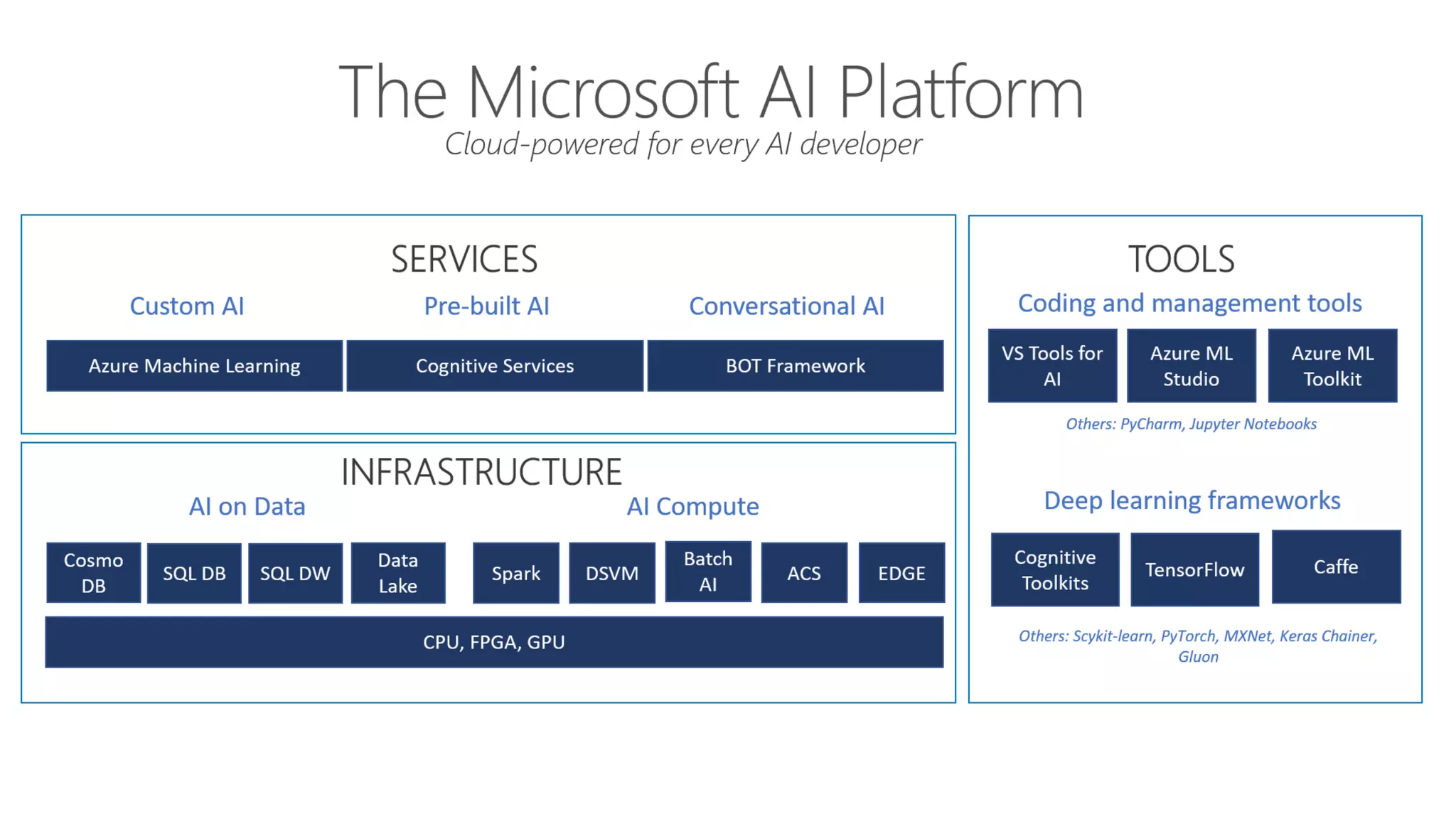 This document discusses artificial intelligence and machine learning tools for .NET developers. It introduces AI tools like Visual Studio Tools for AI and Azure Machine Learning Studio. It also covers pre-built AI with Azure Cognitive Services, custom AI with Azure Machine Learning Service, and conversational AI with LUIS and QnA Maker. The document demonstrates machine learning for .NET with ML.NET and shows a movie recommender example. It also promotes data science VMs, Microsoft Research open data, and the Microsoft AI School.