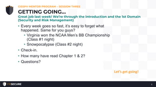 This document summarizes session 3 of a 2019 CISSP mentor program. It discusses risk analysis, including qualitative and quantitative approaches. Key terms like asset value, exposure factor, single loss expectancy, and annualized loss expectancy are defined. Examples of risk analysis calculations are provided. The session also covered risk management processes, risk choice options, and included a quiz to test understanding.