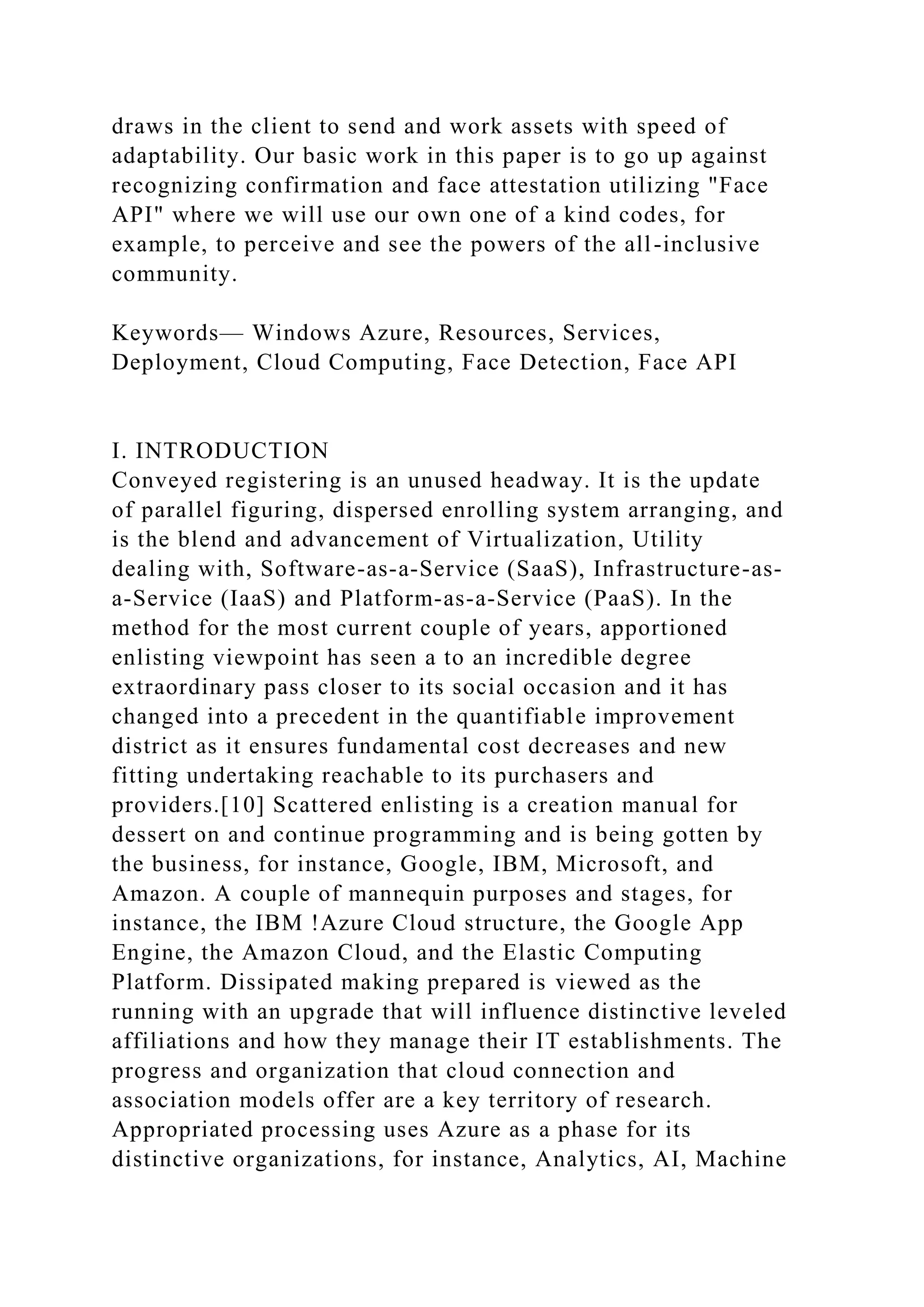 This paper presents a comprehensive overview of Microsoft Azure and its cognitive services, focusing on cloud computing capabilities, deployment models, and the use of the Face API for facial recognition. It covers Azure's infrastructure, services, and components, as well as various cloud service models such as PaaS, SaaS, and IaaS. The aim is to demonstrate how Azure can be utilized for real-time applications, particularly in face detection and recognition technologies.