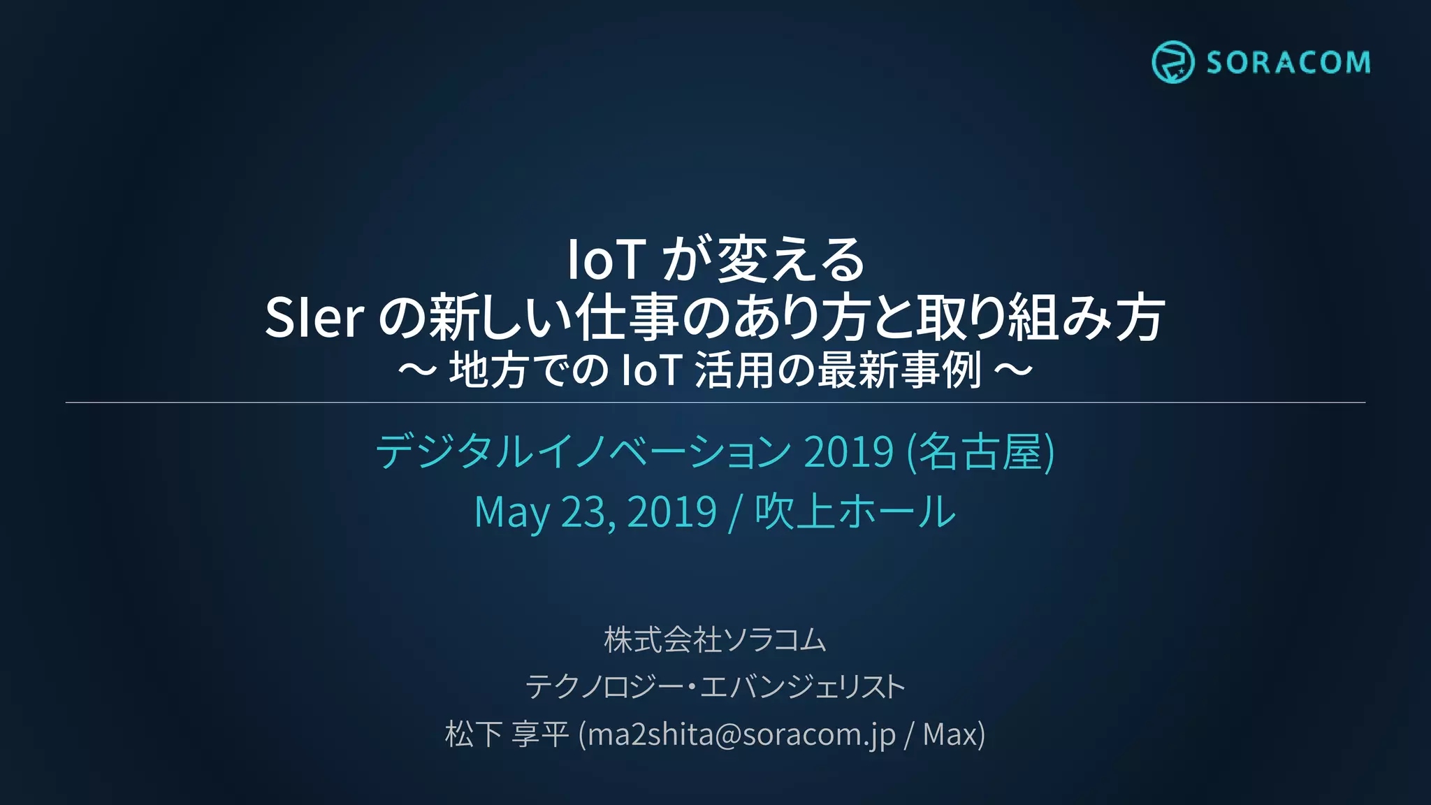 日経デジタルイノベーション2019 (名古屋) IoT が変える SIer の新しい仕事のあり方と取り組み方 ~ 地方でのIoT 活用の最新事例~ 株式会社ソラコム テクノロジー・エバンジェリスト 松下 享平