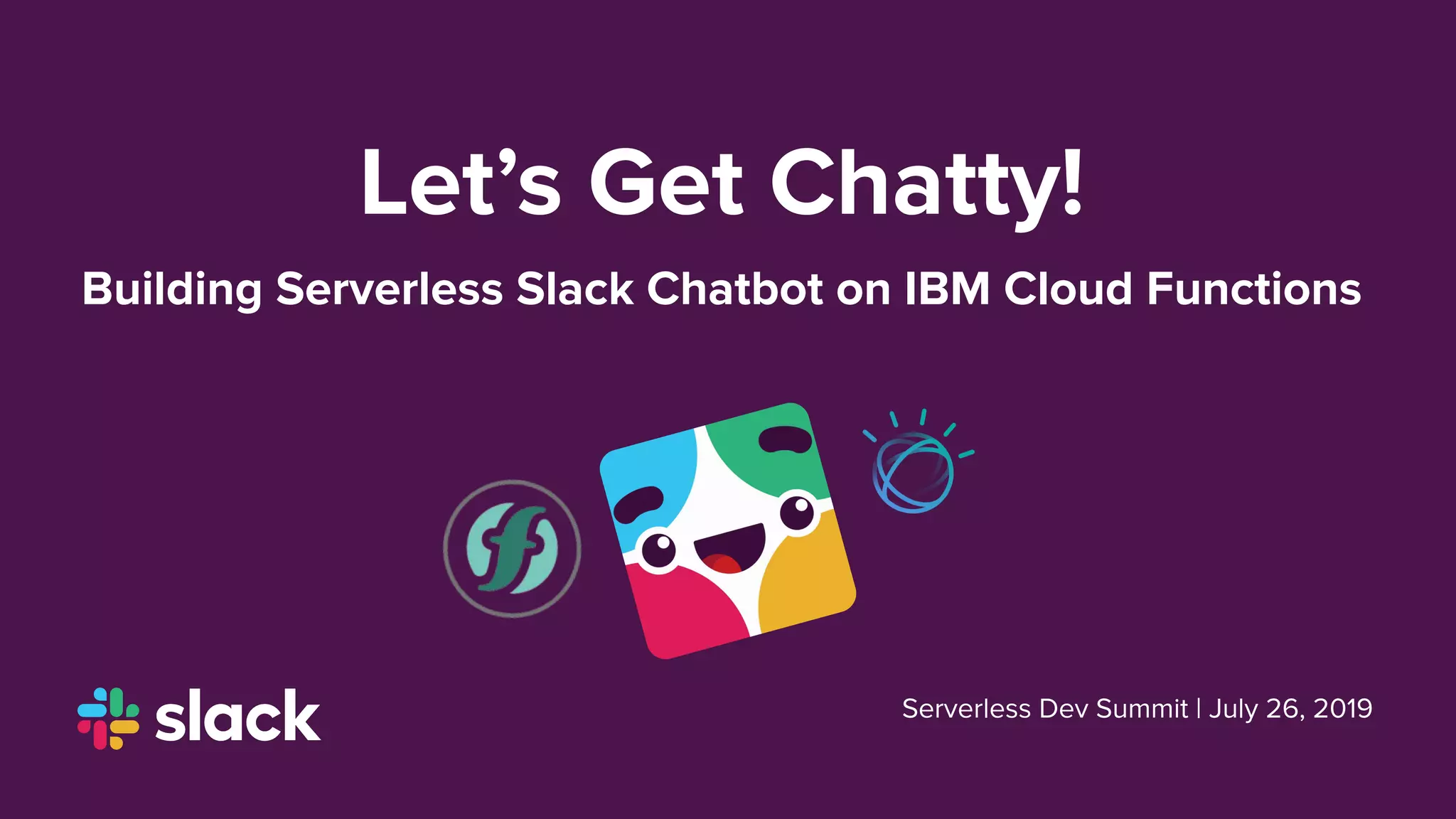 This document discusses building a conversational chatbot for Slack using IBM Cloud Functions and Watson Assistant. It begins with an overview of bots and conversational interfaces. It then demonstrates how to create a basic bot that responds to "Hi" messages using the Slack API. The document explains that Watson Assistant can be used to make the bot smarter by integrating natural language processing. It shows how to create an IBM Cloud Function action, expose an API endpoint, and configure a Slack app to receive events and send responses. The source code is provided on GitHub for a serverless Slack chatbot using IBM Cloud Functions and Watson Assistant.