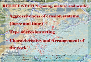 The document discusses various geomorphic processes that shape the Earth's surface. It describes exogenic processes like weathering, erosion and deposition that are driven by external forces such as water, wind and ice. It also describes endogenic processes like mountain building and volcanism that are driven by internal forces within the Earth. Specifically, it provides details on different types of weathering processes including physical, chemical, biological and their effects on breaking down rocks into sediments. It also discusses factors that control the aggressiveness of different geomorphic processes like the characteristics of rocks and variations in climate and topography.