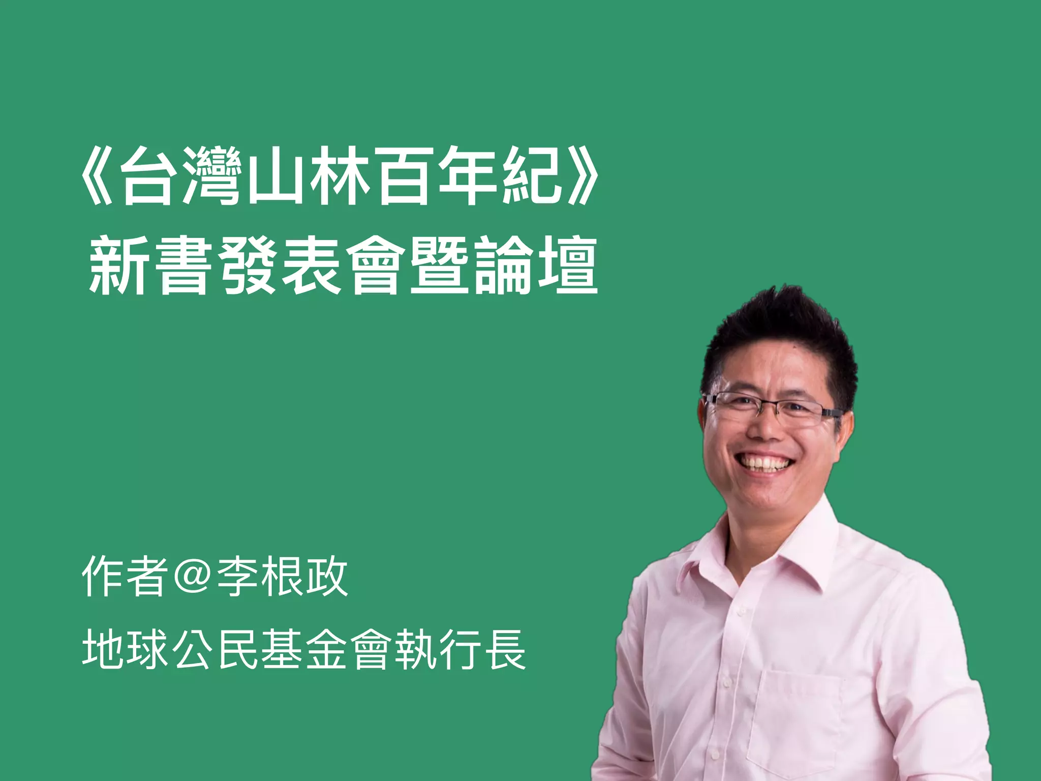 !1 《台灣⼭山林林百年年紀》 新書發表會暨論壇 作者@李根政 地球公⺠民基⾦金金會執⾏行行長