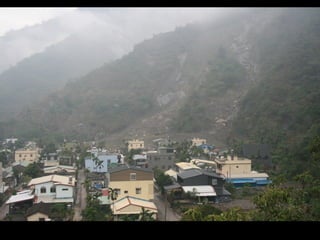 在百年年⼭山林林開發和氣候變遷的雙重威脅 下,⼭山區的原住⺠民部落落正⾯面臨臨巨⼤大的⽣生 存挑戰。 新好茶茶村已被⼟土⽯石流淹沒?連同這張家屋牆上的壁 畫。 攝影@李根政