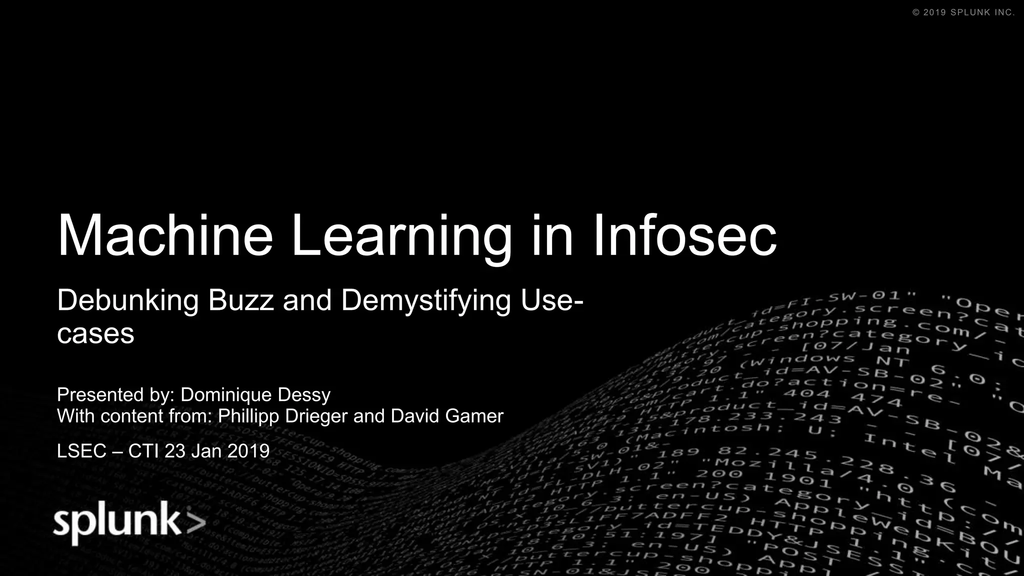 The document discusses machine learning in security and provides examples of its applications. It begins with defining machine learning and explaining how it can augment security investigations by enabling bulk data analysis, anomaly detection, and focusing analyst time. The document then discusses common machine learning techniques and use cases in security domains like fraud detection and insider threat. It also provides a worked example of using machine learning to detect domain generation algorithms (DGAs). Finally, it discusses best practices for integrating machine learning into existing security operations center workflows and processes.