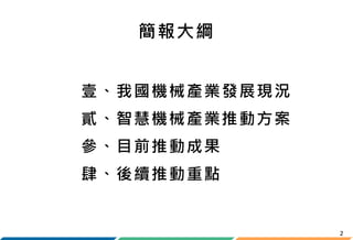 本文件讨论了台湾智慧机械产业的发展现状与推动方案,明确提出了提升中小企业数字能力及整厂整线输出的两大愿景,并介绍了已取得的推进成果,包括建立智慧制造试营运场域及吸引国际合作。文中还提及即将实施的投资抵减措施,旨在促进智慧机械领域的投资与发展。