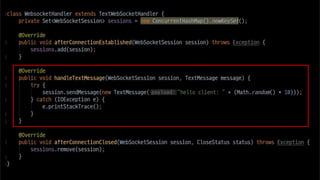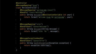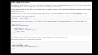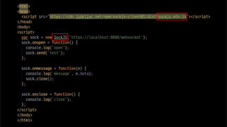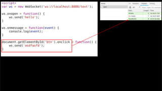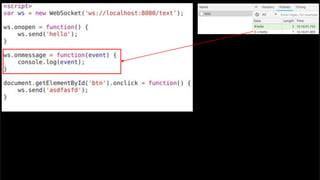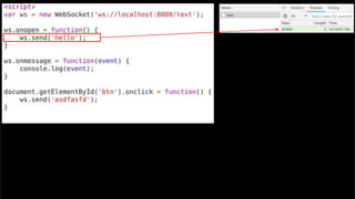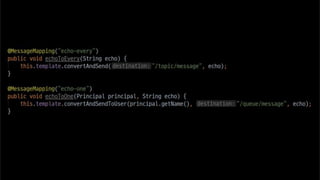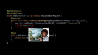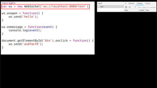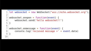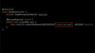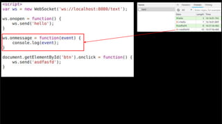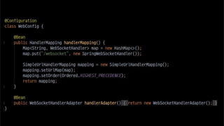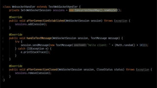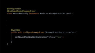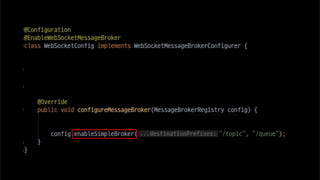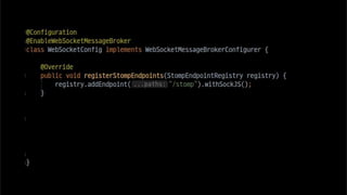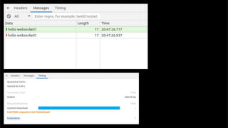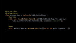 The document discusses using websockets for real-time applications. It explains the differences between polling and websockets, how websockets work at a high level, and how to implement websockets using Spring including STOMP messaging protocol and a message broker. Spring makes it easy to build scalable websocket applications with loose coupling between components.